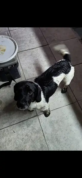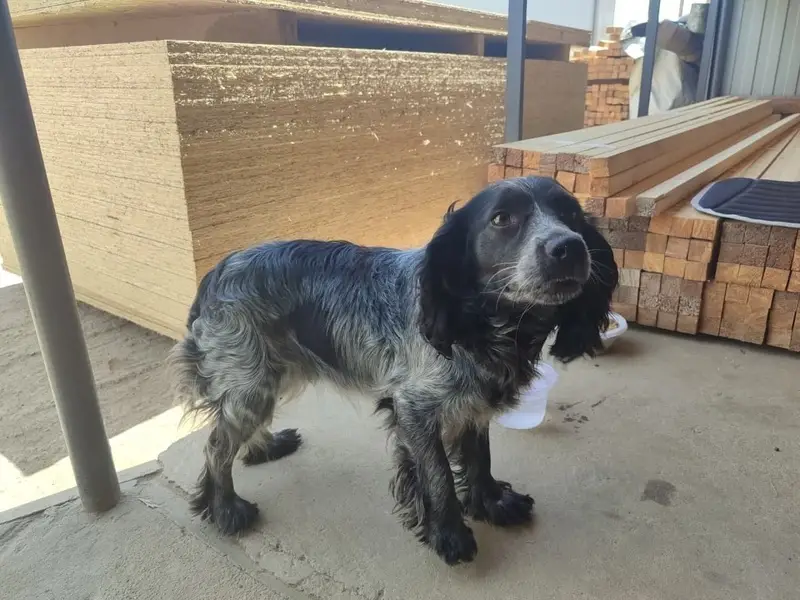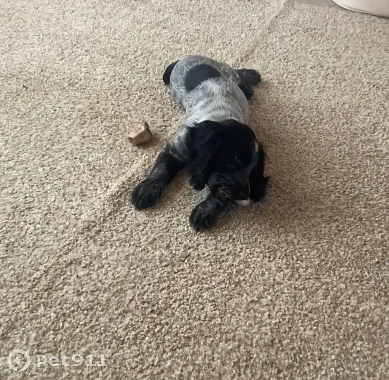 Серо-пегая, морда и уши, лапы чернапорода Русский спаниель, на лбу белое пятно, на спине ближе к хвосту черное круглое пятно, хвост купирован. Оранжевый ошейник. 5 месяцев.