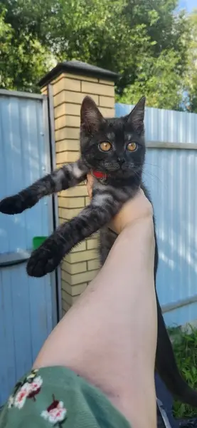 Чёрно-серый полосатый глаза желтыеочень ласковый добрый