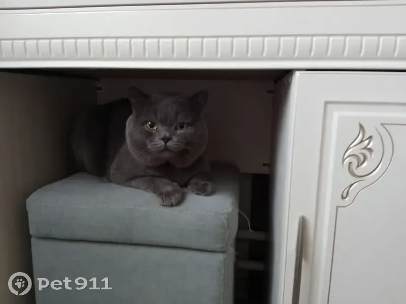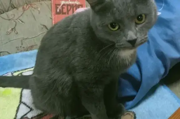Серый кот Британец, не кастрирован, зовут Лёва, на нем был красный ошейник с именем/номером тел. И колокольчиком. Ходил гулять постоянно и сам возвращался к подъезду. На улице не первый раз, может за себя постоять. С людьми не агрессивен, обычно доверяет тем, кто его кормит...На руках не любит сидеть, быстро спрыгивает