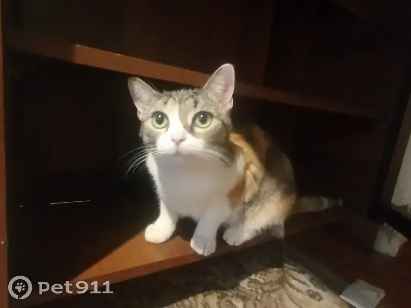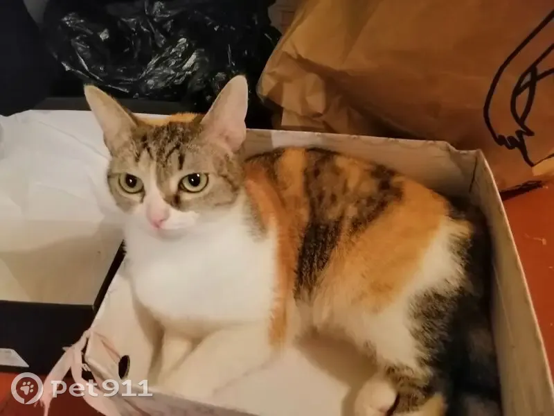 Кошке полтора года, среднего размера, худенькая, черепаховая окраска, то бишь разноцветная. Отличительная черта - все лапы белые, кроме одной задней, на ней нет белого пигмента. Кошка домашняя, ребёнок вынес на улицу и она угналась за чужим котом, обратно не вернулась.