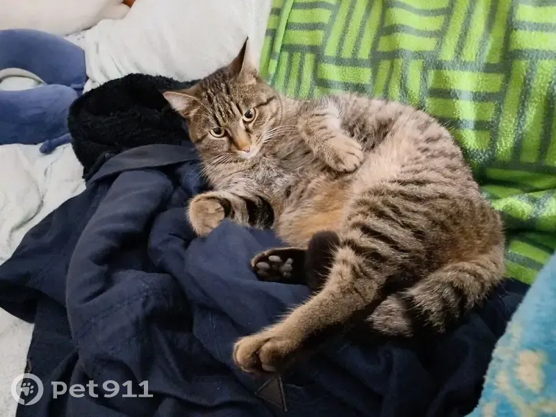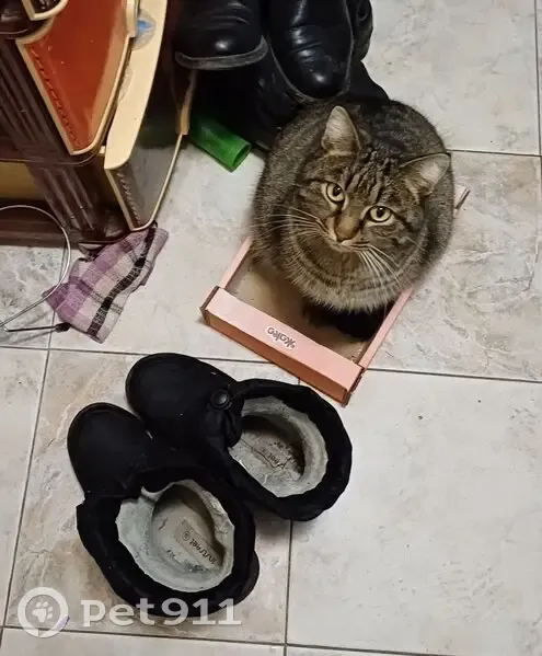 Кот; гладкошерстый полосатый, окрас "Типичный Барсик". Лапки темненькие, глаза круглые, уши заострённые, пухлый. Вырвался из рук при поездке в ветклинику. Очень пугливый, осторожный.