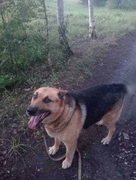 Собака рыжеватого окраса, есть ошейник, спокойная, агрессии не проявляет, знает команды