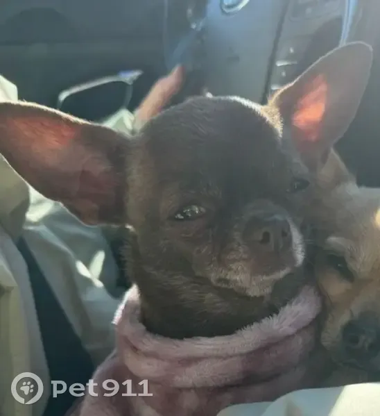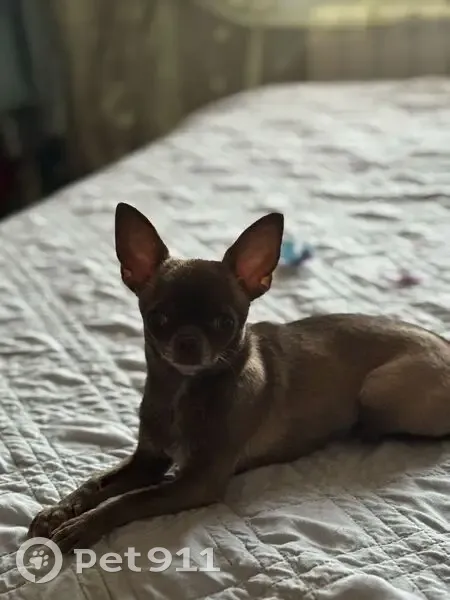 Собака породы чихуахуа коричневого цвета откликается на имя Поночка Пона. Вокруг носика белые полосочки. Бока коричневопесочнве, хребетик коричневый. Собака чипирована.