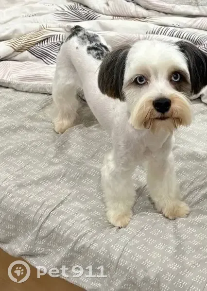 Упал поводок рулетка из рук и собака сбежала вместе с ним, не смогли догнать. Был одет в синюю жилетку, на шее светящийся поводок. И к жилетке прицеплена черная рулетка фирмы flexi. Бусик породы бивер стандартного размера, вес около 5 кг. Окрас белый с черными пятнами. Глаза голубые.