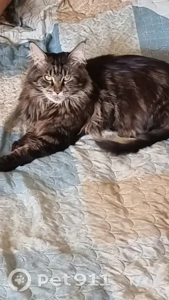 Мейн-кун, хвост объеден, не пушистый. Окрас черный мрамор, с полосами на боках. Пугливая. Ушла из дома и не вернулась, по ходу обижена после лечения утром, капали глаза