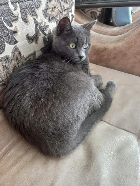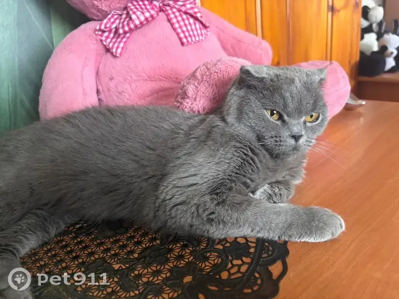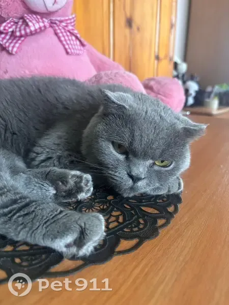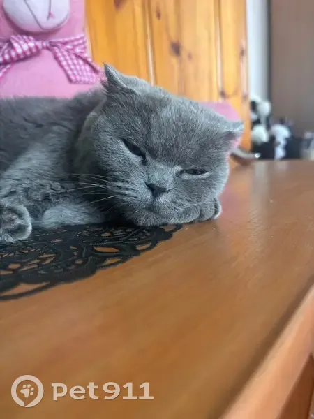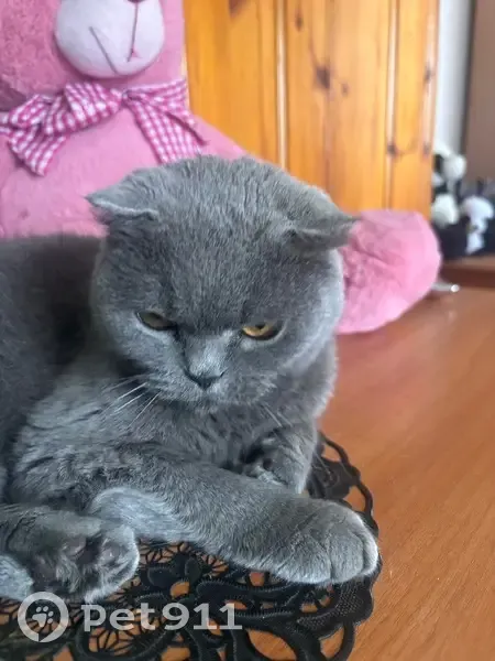 шотландская вислоухая кошечка,окрас сплошной,без пятнышка.Цвет виден на фото.Глазки желтые,как у совушки.Хозяин,отзовись поскорее,у нас два больших кота,они ей спокойствия не дадут,пока изолируем,но скоро похолодает,все котики будут дома!