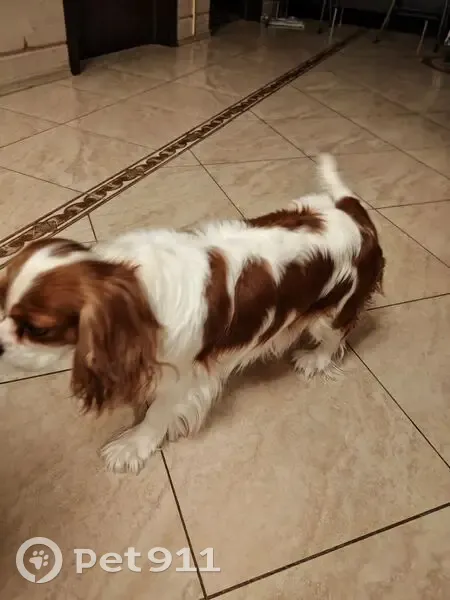 Окрас Белый, рыжий. Порода Кавалер-кинг-чарльз-спаниель. Предположительно старше 2 двух лет. У нее течка. Клеймо не читается первая буква Т затем О или U.