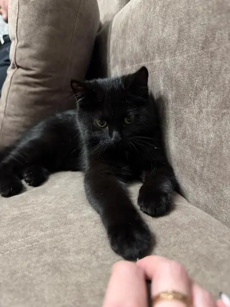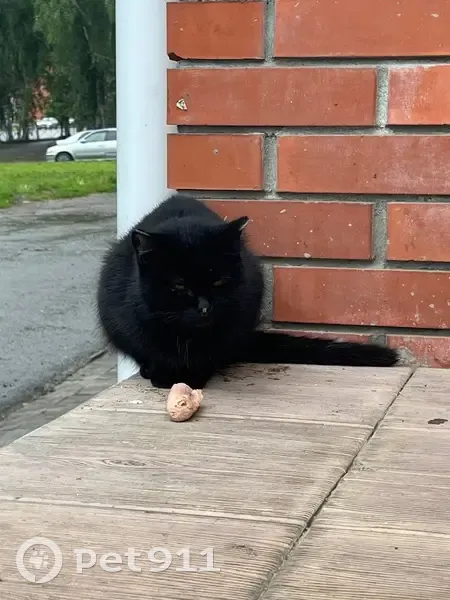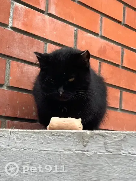 Найден кот или кошка, окрас чёрный, кончики ушей слегка белые. Глаза жёлтые/коричневые, правый глаз плоховато открывается. Дрожит, но не убегает, еду принимает с опаской. Сидит около стоматологии Лекарь-Дент.