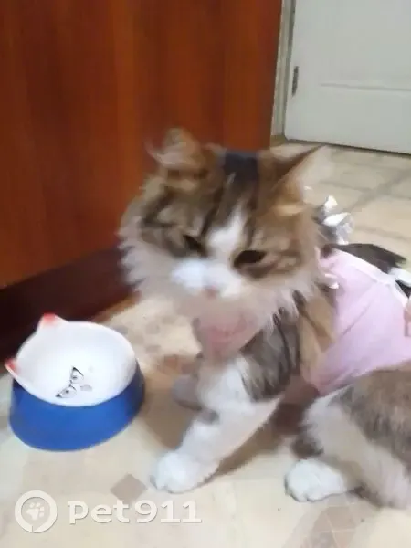 Трёхцветная(серо-коричнево-белая),лапки и грудка белые,на правой задней лапке чёрное пятно. Возраст 1 год 9 месяцев. Привита,стерелизована. Пропала с участка 18 сентября 2025 года.