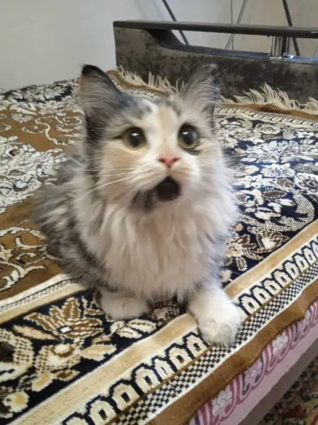 Кошечка, серая, на ушах кисточки, ласковая, не кусается, оставила окно открытым забыла, пришла домой ее не было