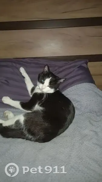Окрас черно-белый, кончик хвоста белый. Не кастрирован. Возможно вывезли в город. Похожего видели в районе ТЦ Любимый. В руки не дается.