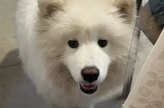 Собака породы самоед. Белый и пушистый. Есть клеймо