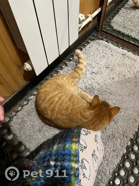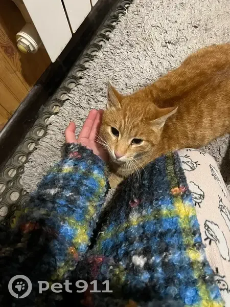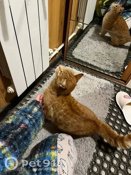 Рыжий кот, людей не боится, ласковый, ручной. В меру упитанный, был очень голоден, когда нашли. Мурчит, ластится. Кажется, молодой, на вид будто года 2-3