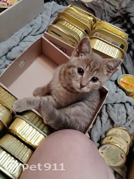 Серый котенок в полосочку, есть и пятнышки, имеет грыжу на животике. Игристый, любопытный, ласковый, когда гладишь может и кусаться и царапать я. Любит наблюдать за телефоном, переписки, игры