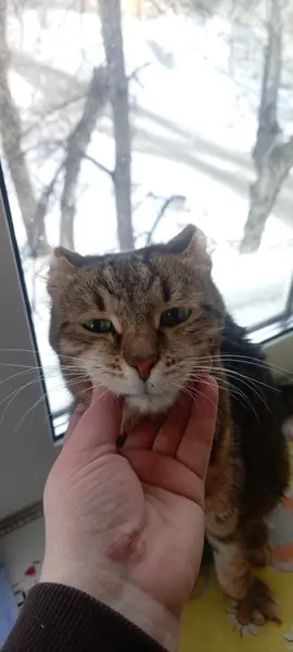 Окрас серый с чёрными полосами, живот светло серый. За правым ухом небольшие шрамы от укусов, глаза зелёные, худое толосложение