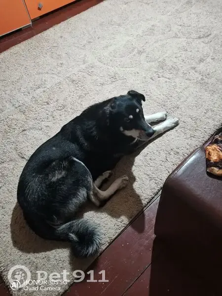 Похож на хаски чёрный с серым, болит лапа, глаза голубые
