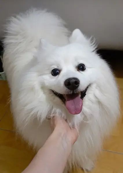 Японский шпиц, белый с пятнами на спине