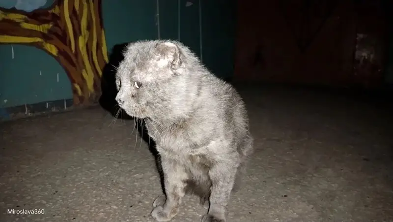 Дымчато-серый с маленьким белым пятнышком на животе, желтые глаза