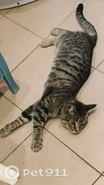 полностью полосатый окрас, черный ошейник (против блох), длинный хвост, большие лапы, крупная голова, нос и уши, при этом с не очень большим телом, "трескучий" голос. Коту около 7-10 месяцев. Характер дружелюбный, спокойный, добрый ЕСЛИ КТО-ТО НАШЕЛ ЕГО И ОСТАВИЛ себе - СВЯЖИТЕСЬ пожалуйста, мы не против оставить котика в новой семье, лишь бы его там не обижали, т. К его подобрали с улицы и искали новый дом, но мы его любим и переживаем