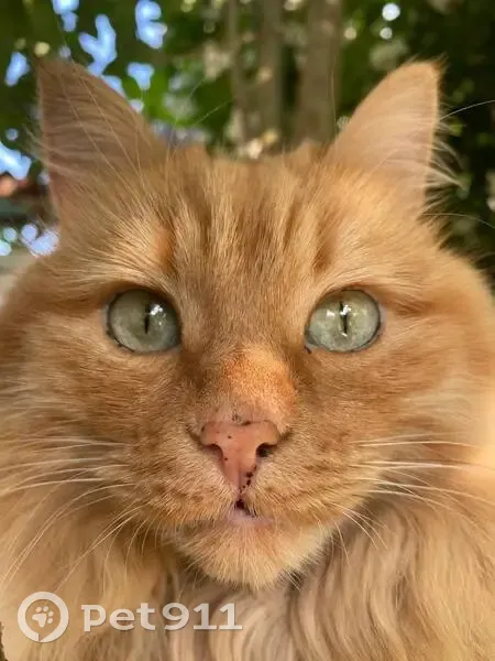 Некрупный, беспородный, рыжий и очень пушистый кот, кастрирован, возраст 7 лет, 11 месяцев. На носу, на веках глаз и в пасти очень много маленьких коричневых пятен- родинок, это генетическое заболевание ЛЕНТИГО. Отсутствует правый нижний клык.