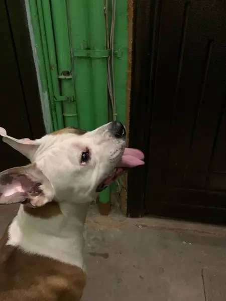 Белый бультерьер, под левым ухом рыжое пятно, щенок 9 месяцев