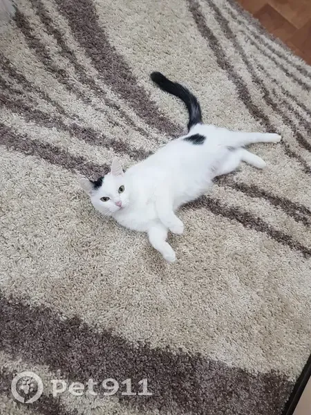 Окрас белый, хвост черный пятнышко на голове черное, и на животе тоже пятнышко тоже черное, выпала с окна примерно в 19-20 вечера, откликается на имя Муся