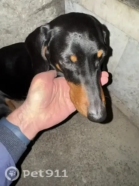 Чёрная такса, видно, что ухоженная! С ошейником и декоративной подвеской, но без данных о хозяине. Сидела неподвижно в углу рядом со Сбербанком, была напугана. Забрали в город, хозяин откликнись!