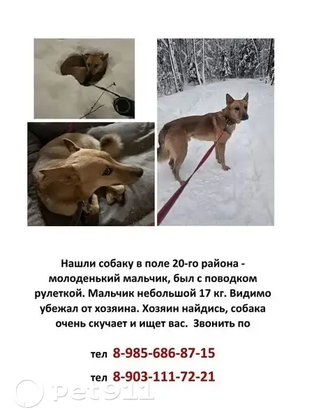 Зеленоград, 20 микрорайон 11.01.2026 Лежал в сугробе в поле в 20-м микрорайоне. Был в ошейнике и с рулеткой. Расклеены объявления, скинули информацию по чатам, но хозяин так и не нашёлся!! ️Оставить пса у себя нет никакой возможности!!! Ищем передержку на время поиска хозяина или новый дом Пёс молодой, небольшой (17кг), очень статный, рыжий, шерсть мягкая, совсем не пахнет, осторожный, пугливный, но очень славный мальчик, который раскроется, если ему найти любящую семью! Ему нельзя в приют!!! ️ Чат помощи : https://t. Me/+32SGc1HwnpE2Mzcy ️+7(985)686-87-15 +7(903)111-72-21