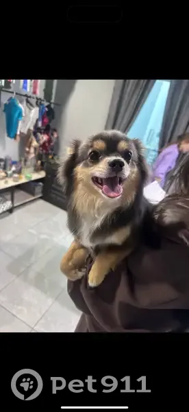 Длинношерстный чихуахуа серо-рыжий, под глазом возможна ссадина так как сбила машина.