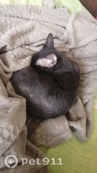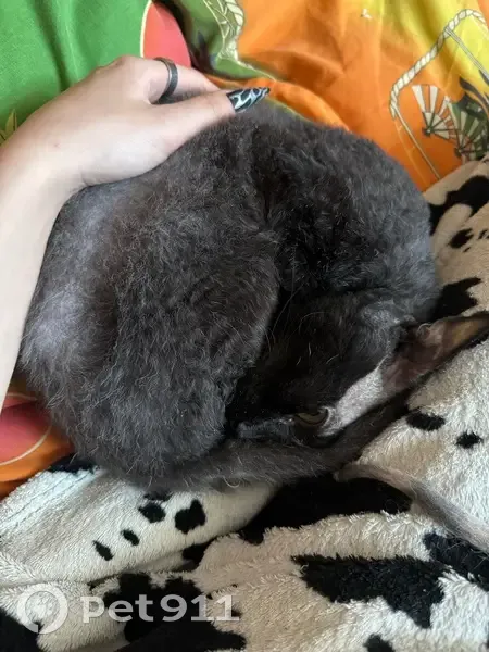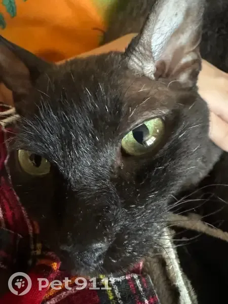 велюровый сфинкс, окрас черный с белыми волосками, сверху лысый хвостик, большие уши и зеленые глаза