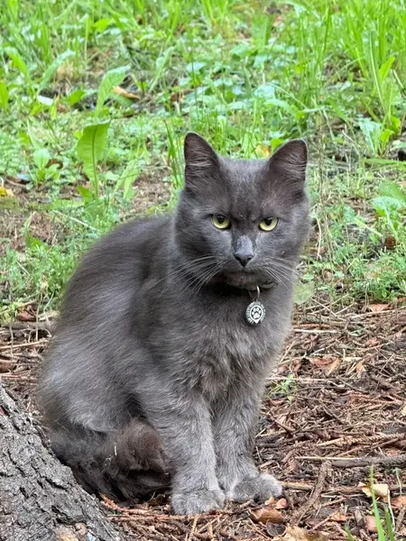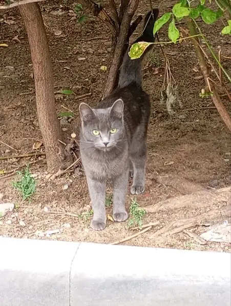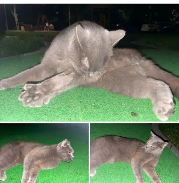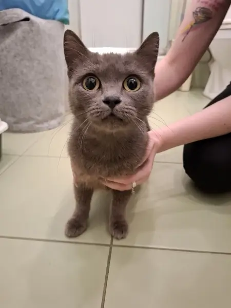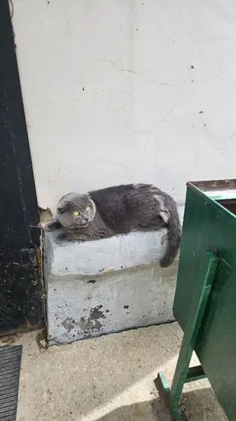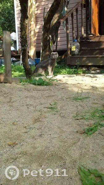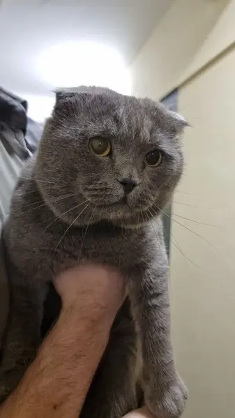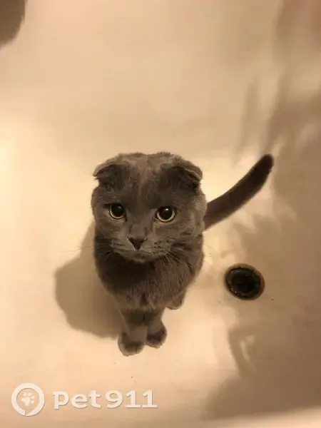 Серый кот, шотландец вислоухий, кот пугливый на кличку редко отзовётся. От страха может шипеть или сильно прижаться к земле. На руки не дается, будет убегать.