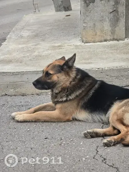 Похожа на овчарку. Хвост высокий. Собака не агрессивная, подходит к человеку, но с опаской. На шее тканевый ошейник с металлической скобой для поводка.