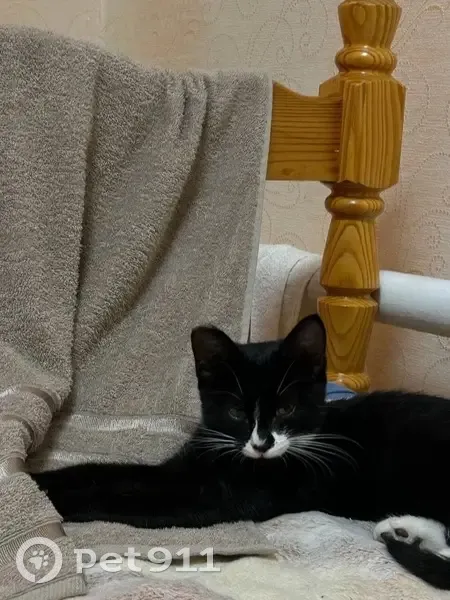 Черный окрас шерсти, белые лапы, белые пятна на животе и мордочке, правое ухо надорвано, голубой ошейник Выбежал утром на улицу гулять и пропал По характеру очень ласковый и игривый