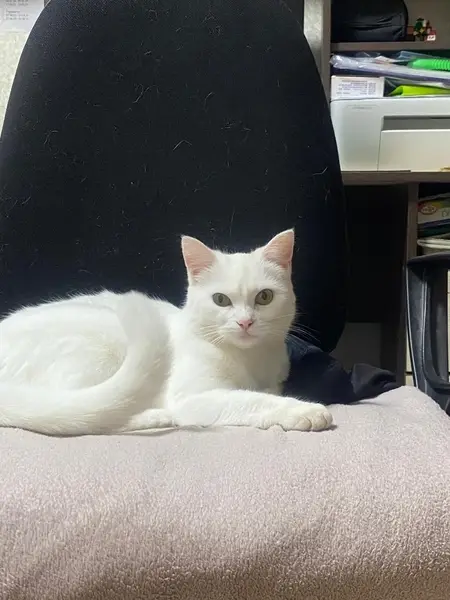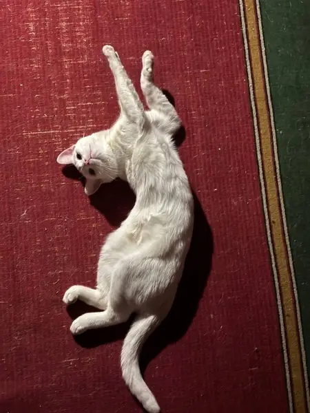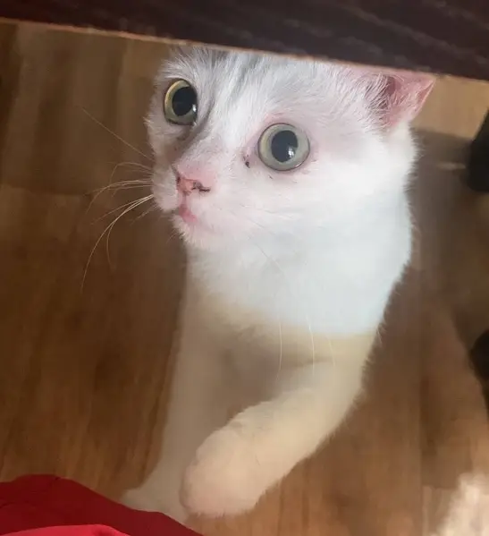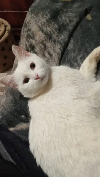 Во дворе дома, найден в конце января 2025. Чисто белый, молодой , гладкошерстный, не кастрированный котик. Примерно год. Ярко желтые глаза. Ласковый, пошёл на руки. Худой, был 3.25 кг . Думали чей то в доме. Со слов соседей неделю был с дворовыми кошками. Заболел, взяли 4.02.25. Вылечили. Тоскует, подходит к двери. Очень умный.