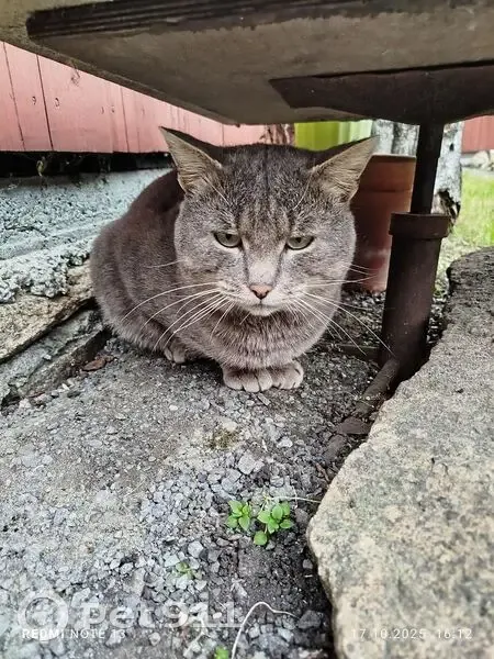 Кот дымчатого окраса, довольно упитанный, видно , что домашний. В руки не дается, очень пугливый. 15 октября 2025 года пришёл на наш участок. Кормлю, но скоро закрытие садового сезона. Забрать к себе на передержку не могу, у ребёнка аллергия. В общем чате садоводов кота не признали. Надеюсь , что хозяин откликнется