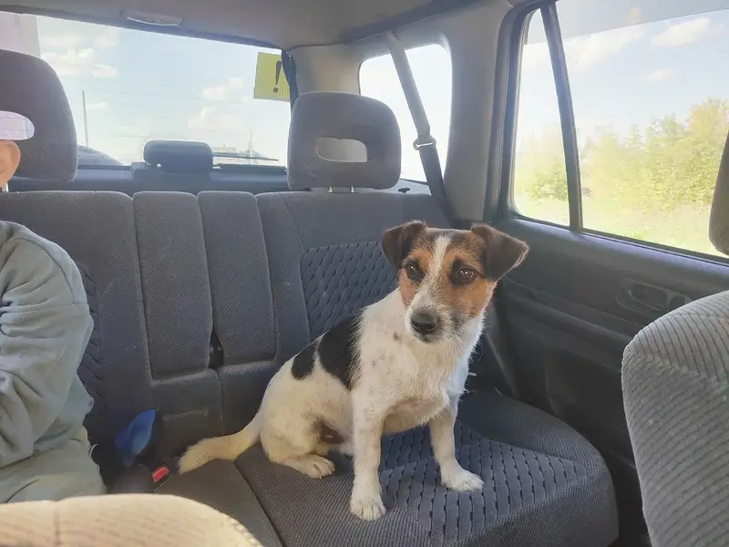 Мальчик, Джек Рассел, серая шлейка. Бегал на улице, прибился к нам, шел до самой квартиры