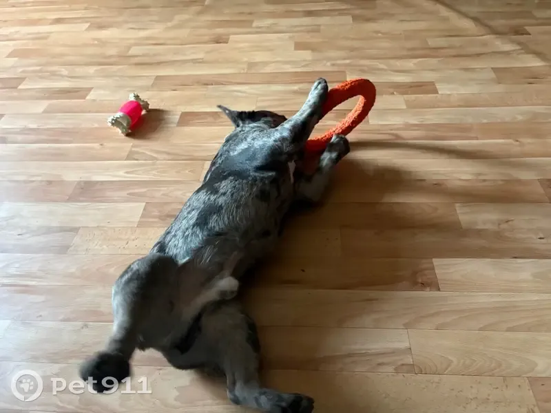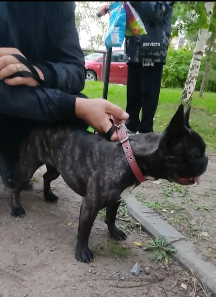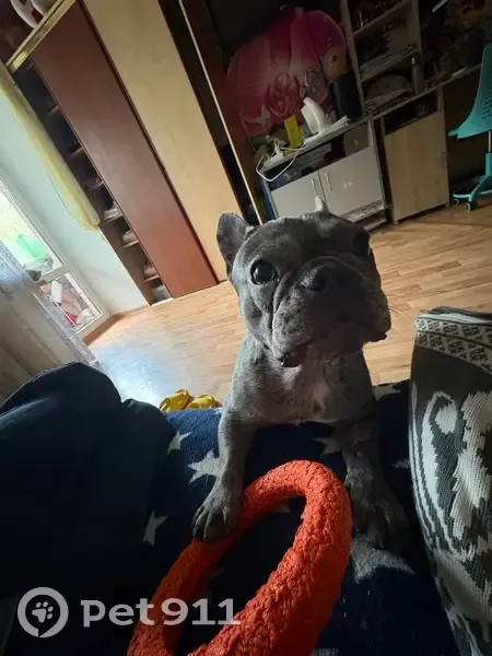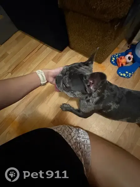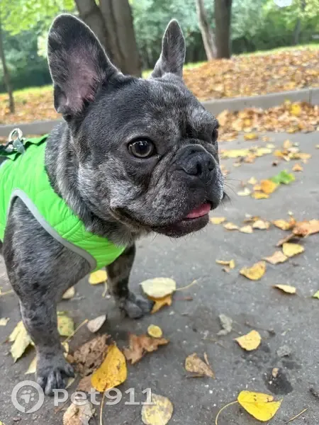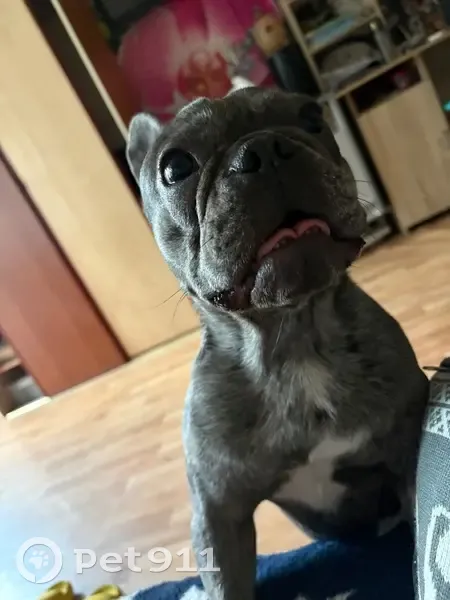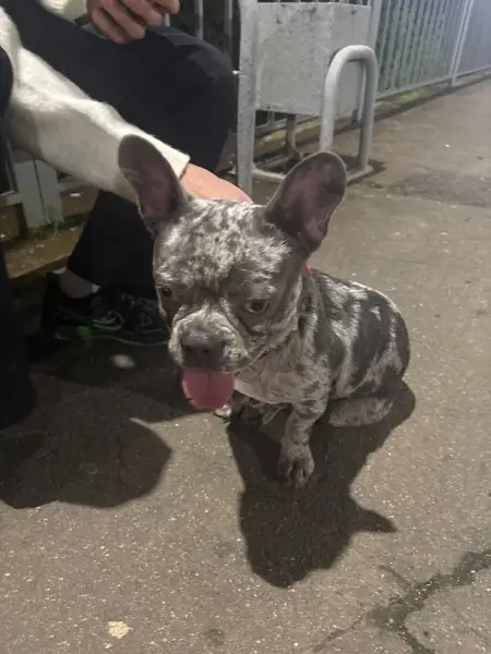 Серый с пятнышками ,вышла гулять ночью ,отвлек мужчина спросил как доехать,прошло 3 минуты а собаки нет ,побежала за дом искать,собаки нет,вернулась к подъезду ни собаки,ни этого человека которому я помогала не было