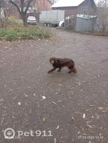 Похож на спаниеля, шоколадно-рыжий цвет, щечки беленькие немного. Искал еду на помойке возле суда. Почтовая улица, Красная улица, пересечение, видели сейчас, в 15 часов 27 октября