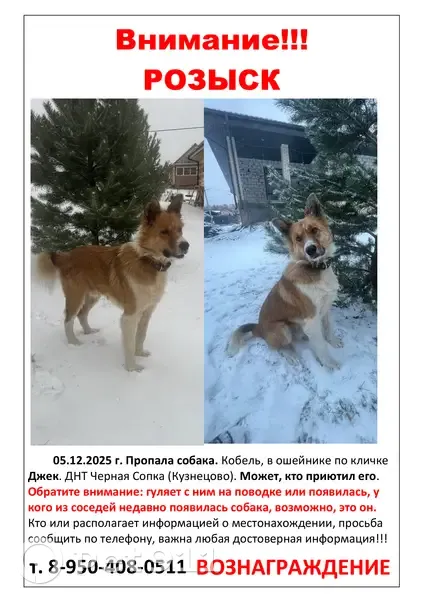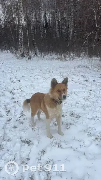 Коричнево белый. Был в ошейнике. Добрый.